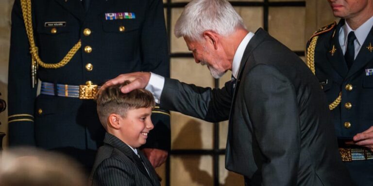Šimon Malý, neuf ans, a reçu des mains du président Petr Pavel la médaille du courage pour avoir sauvé son...