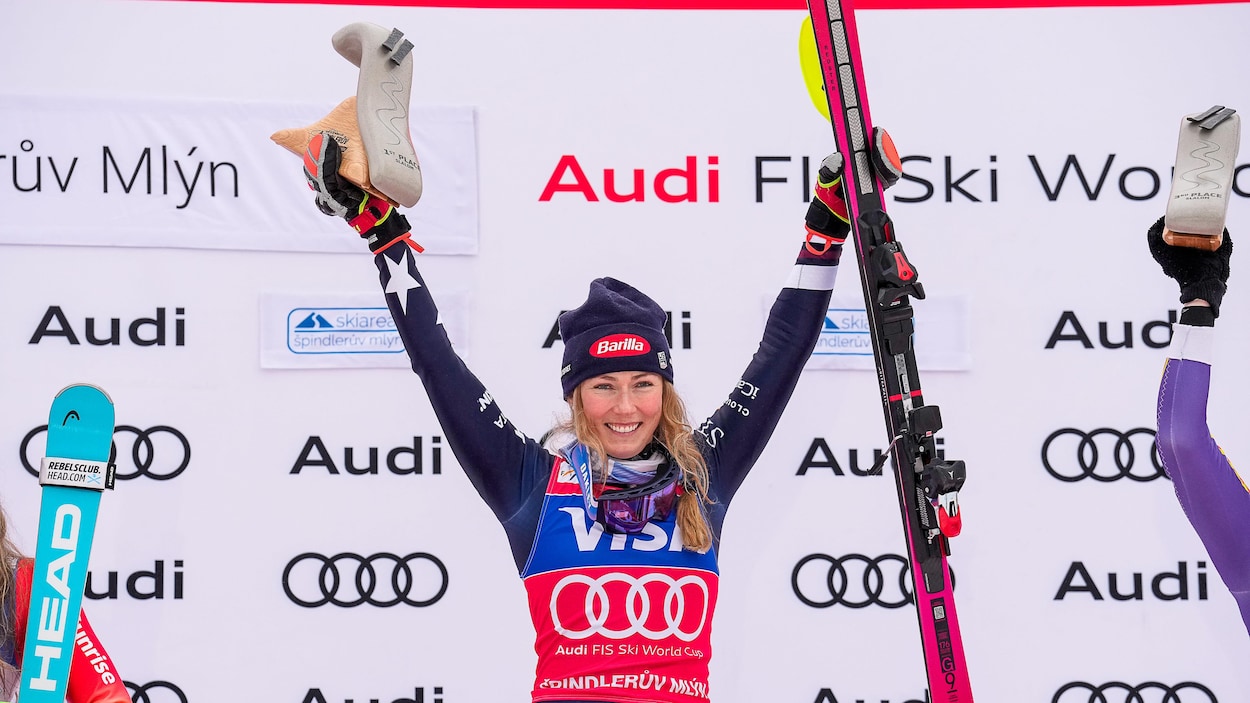 Victoire et petit globe pour Mikaela Shiffrin, en démonstration à Spindleruv Mlyn